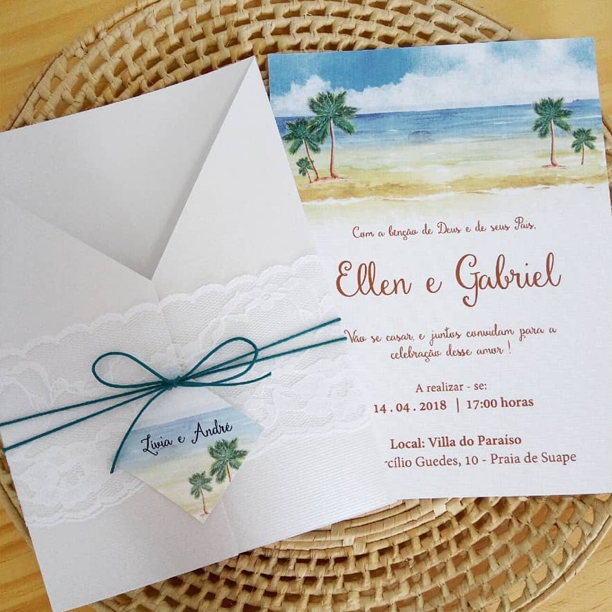 Mas, não existem regras! O importante é que o convite agrade os noivos e não fuja totalmente da proposta do evento. Não faz muito sentido colocar imagens e cores que remetam ao mar se o casamento não for na praia, por exemplo.