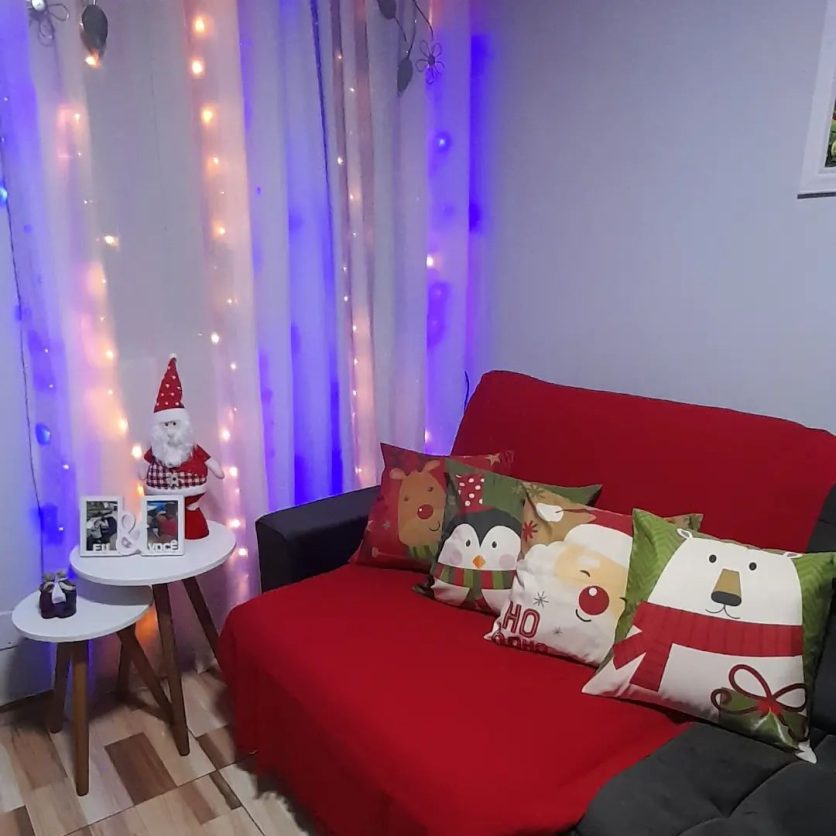 A árvore de Natal é o grande destaque do ambiente, então, capriche nos enfeites e não se esqueça do pisca-pisca. Almofadas temáticas e pequenos quadros natalinos complementam a decoração.