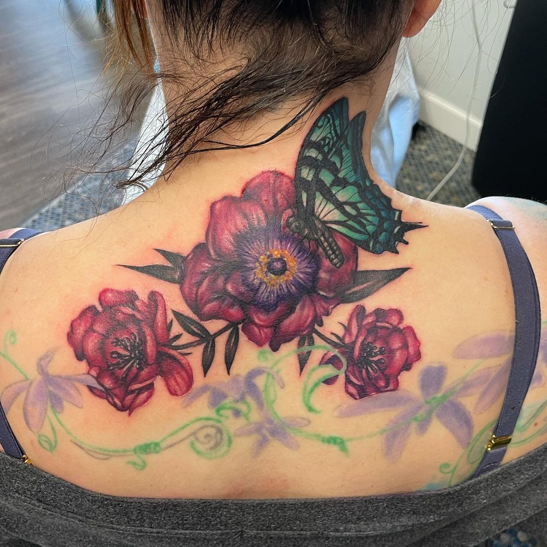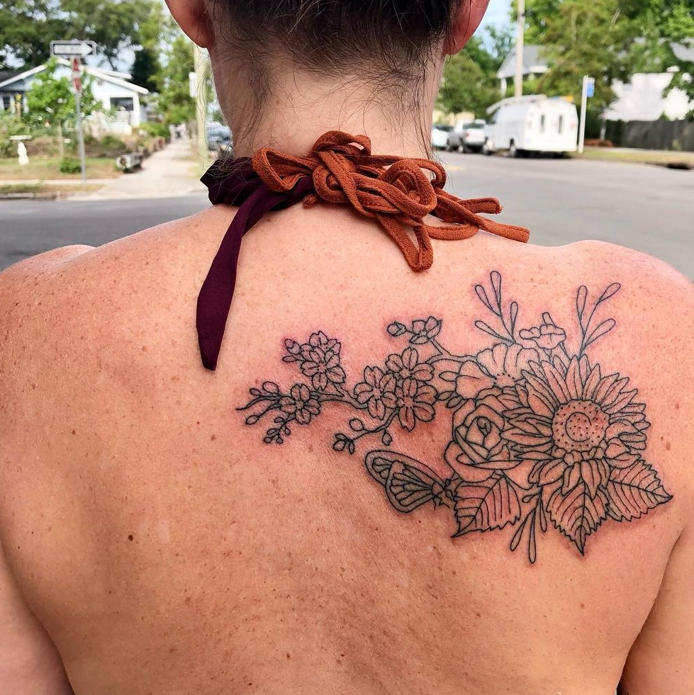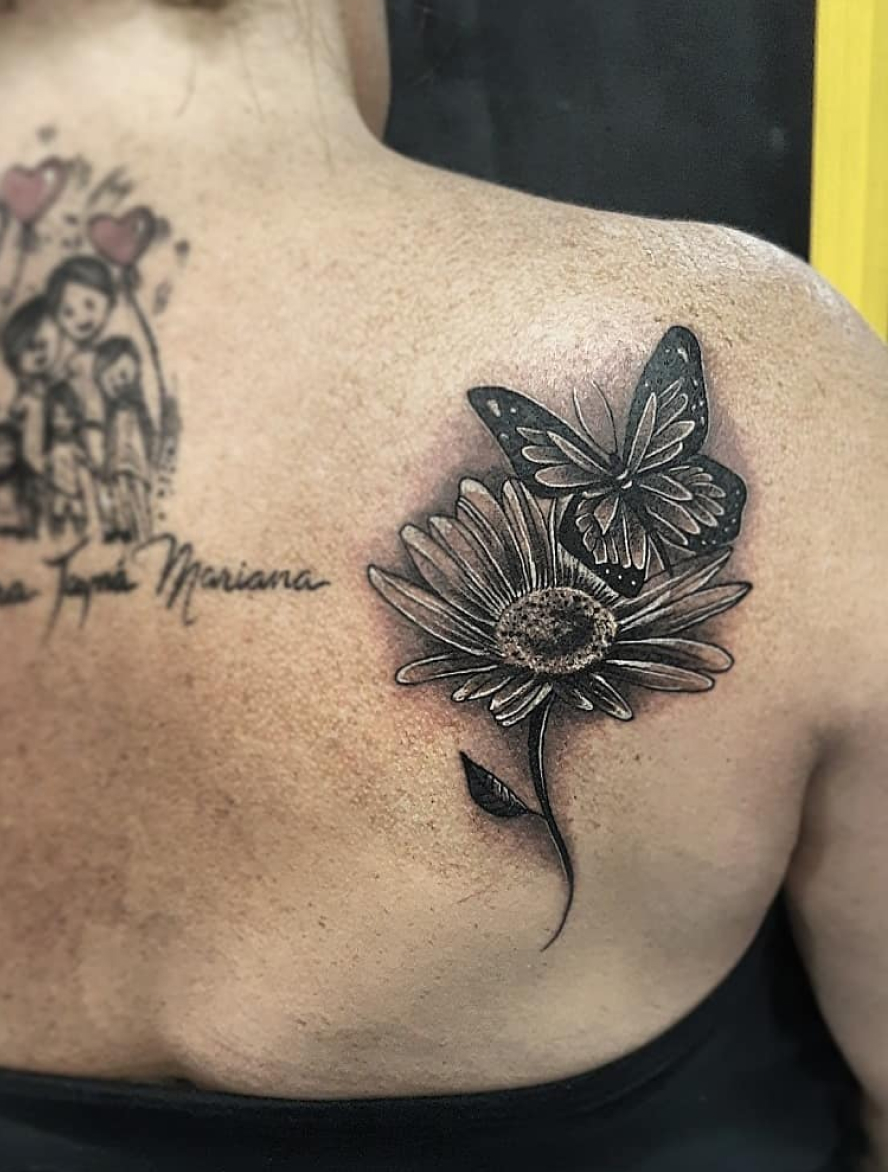 5. A tatuagem de flor e borboletas nas costas faz sucesso