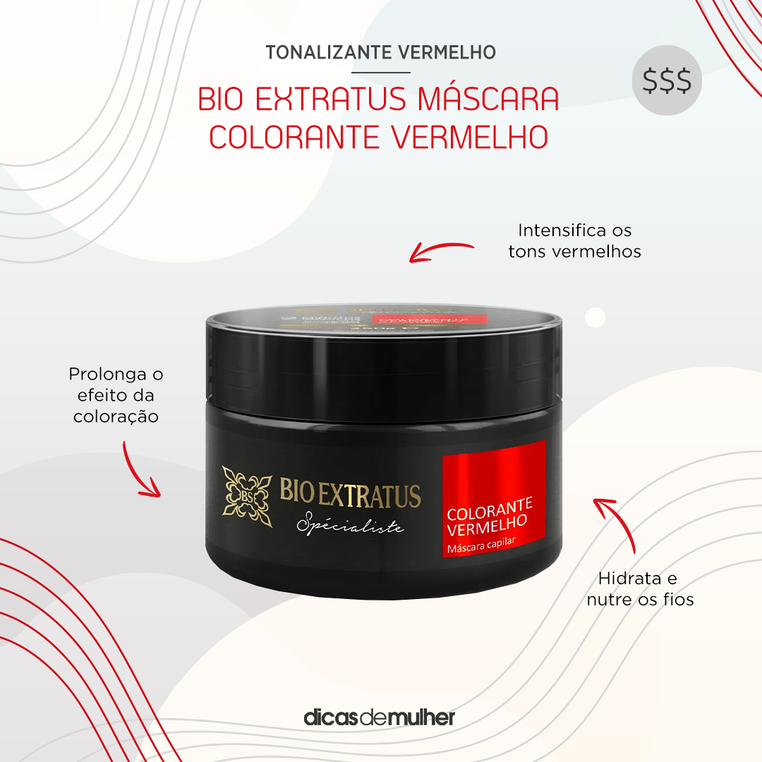 A máscara da Bio Extratus age como tonalizante para intensificar a cor dos fios tingidos com vermelho intenso. O produto possui pigmentos de alta qualidade e proporciona hidratação, nutrição e brilho aos cabelos.