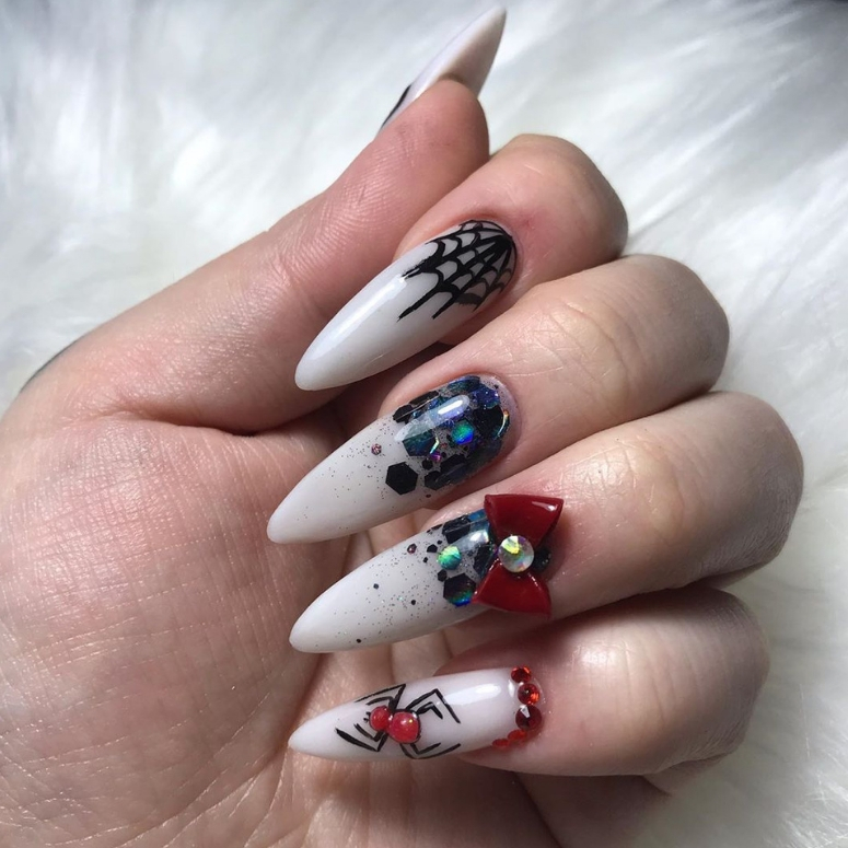 Se você quer uma unha decorada um pouquinho mais discreta, vale apostar nessa inspiração com preto e branco. Para fazer os risquinhos da teia, você precisará de um pincel bem fininho – e um pouco de firmeza nas mãos, claro. Veja o passo a passo!
