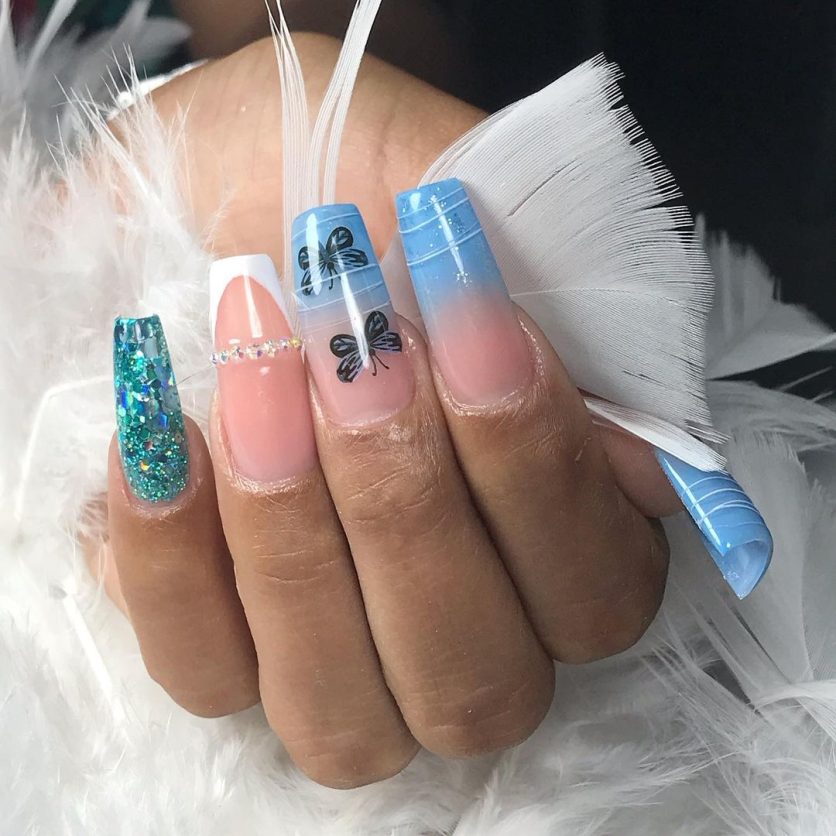 9. A unha em gel azul claro com borboleta é romântica e fofa
